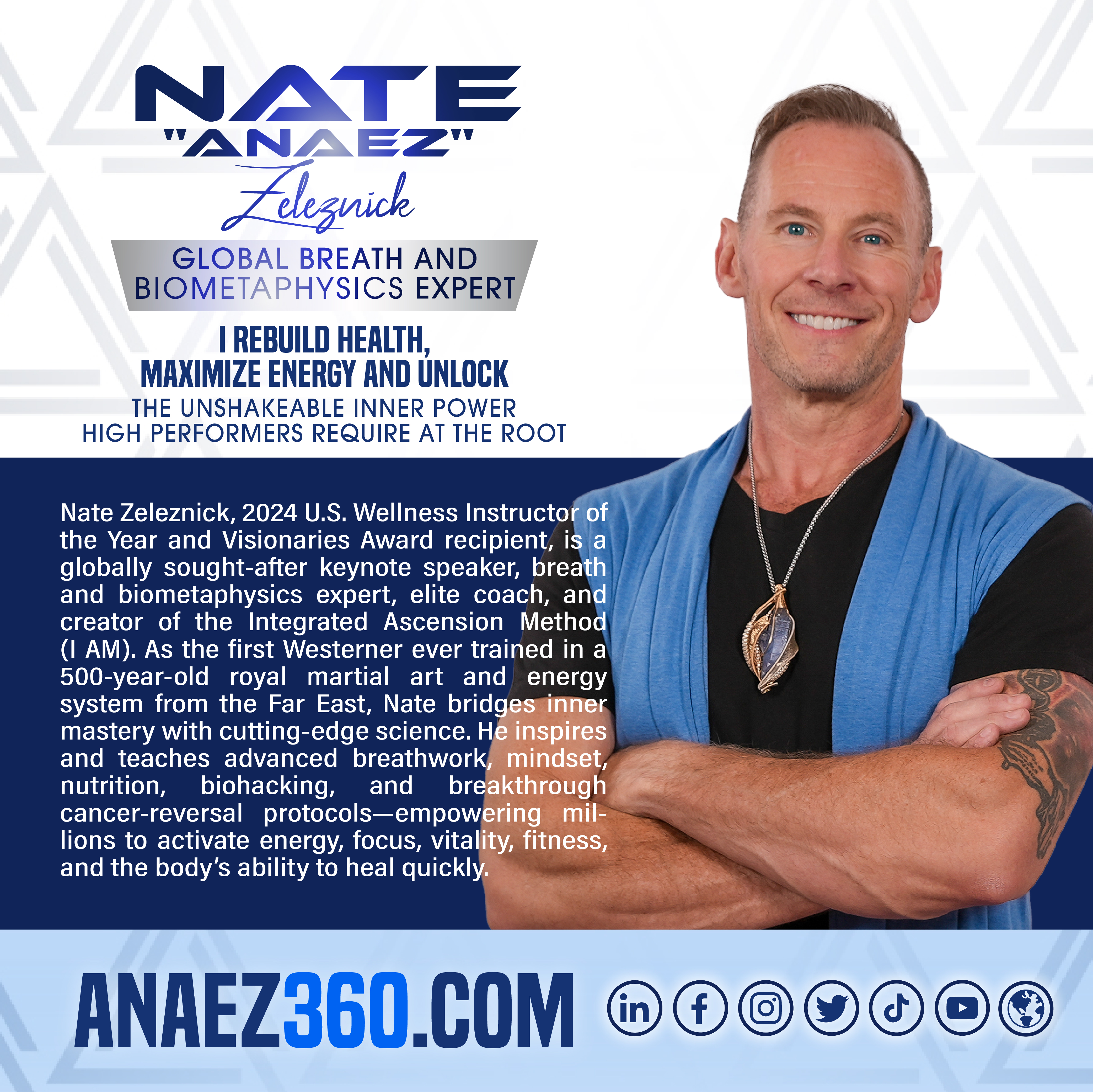 The I AM Method, combining time-tested energetic practices with 21st-century technology, offers a proven roadmap for regeneration and performance. His system has been featured in award-winning documentaries on Netflix, GAIA, and Amazon Prime and validated by professionals across neuroscience, medicine, quantum physics, and consciousness research. Nate also hosts transformative content on PMC Global and Gnostic TV, reaching more than 50 million viewers monthly.